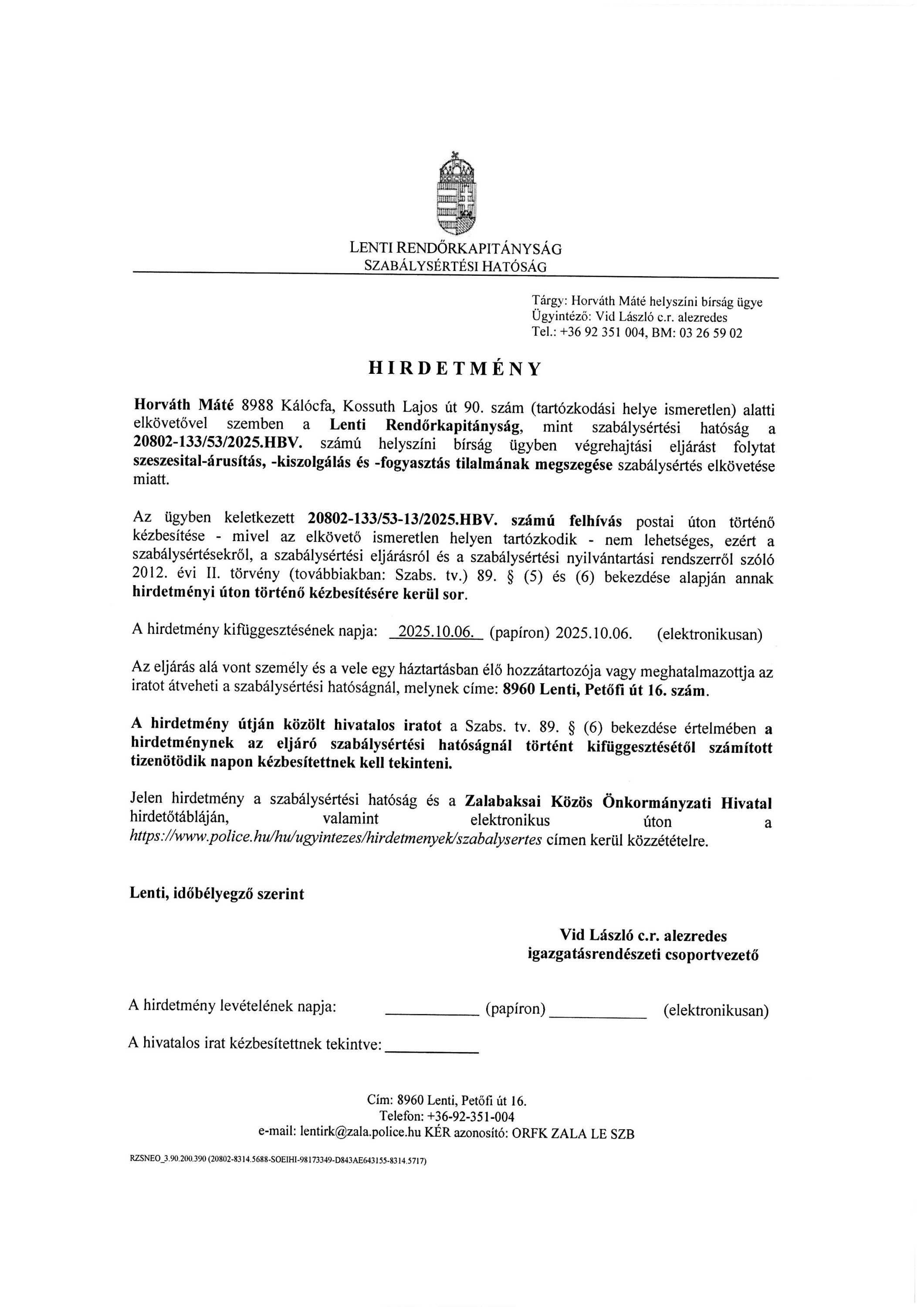 20802-133/53-13/2025.HBV. számú felhívás hirdetményi úton történő kézbesítése