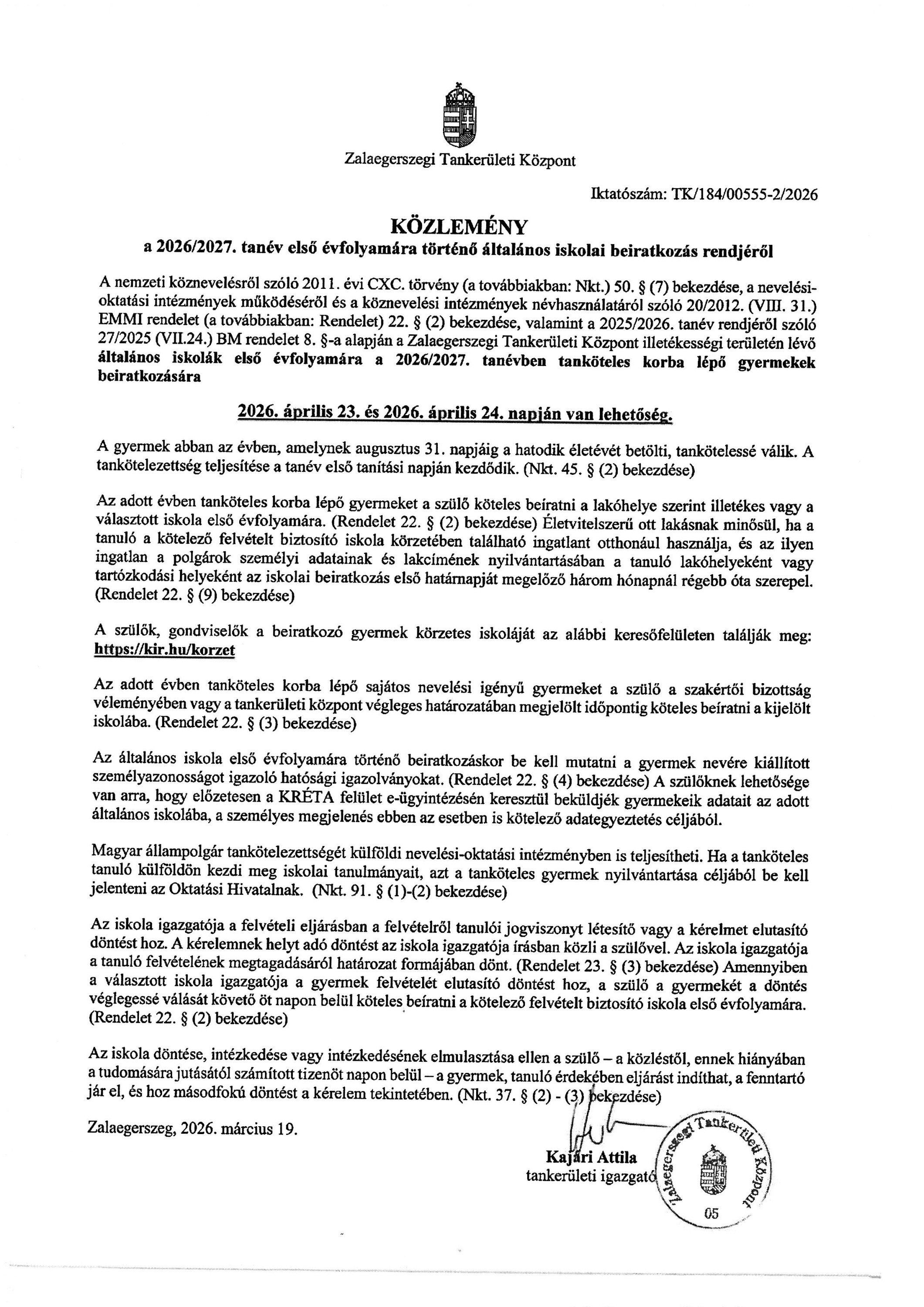 Közlemény a 2026/2027. tanév első évfolyamára történő általános iskolai beiratkozás rendjéről